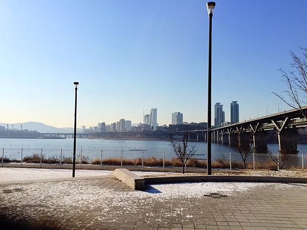 週邊也有一個緊鄰漢江的步道 我們有看到人沿著步道慢跑呢